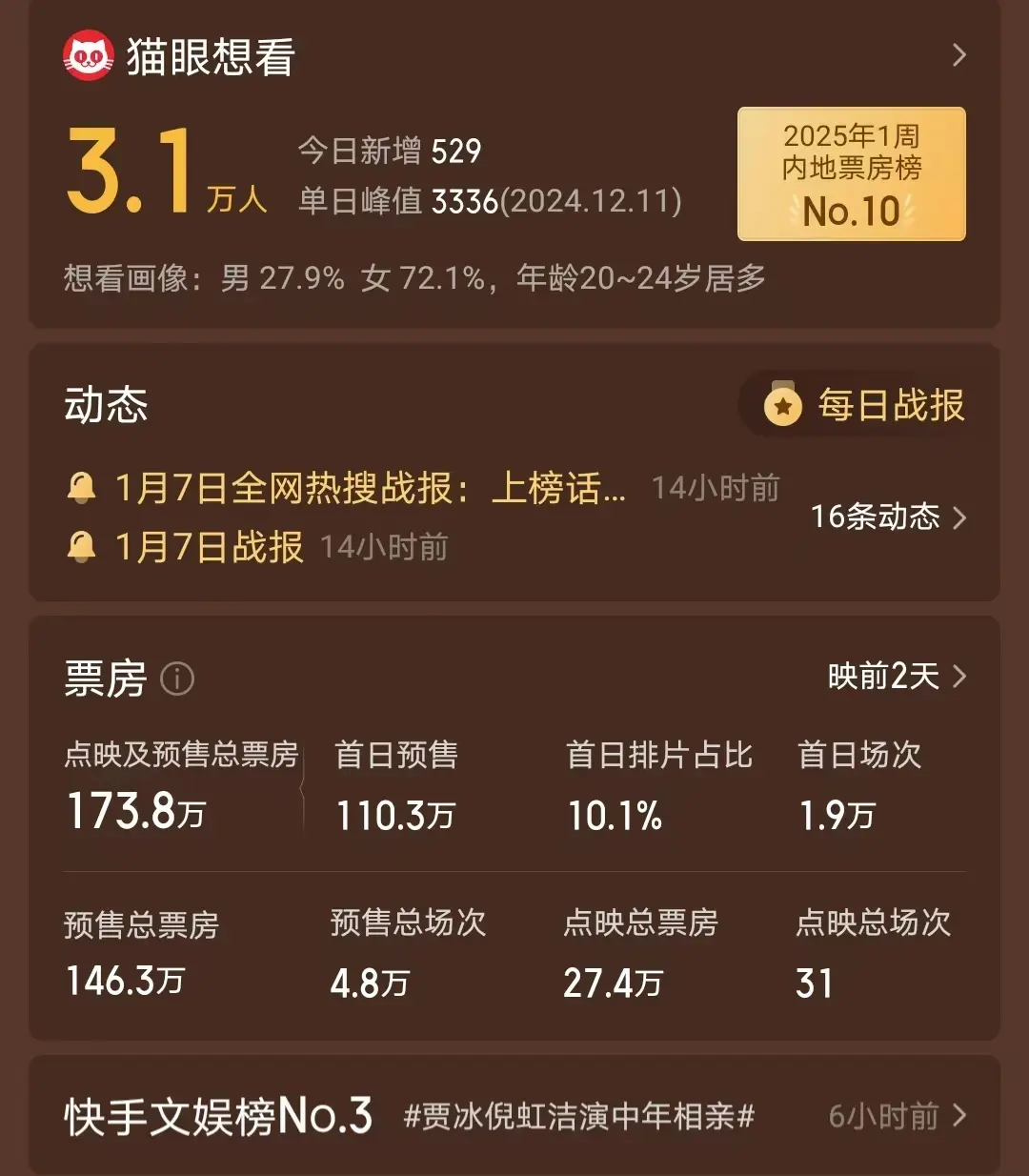不过理想很美好,现实却很骨感。贾冰自导自演的《假爸爸》,曾于几天前就开启了票房预售和超前点映,到现在该片的预售和点映累计总票房却只有173万人民币。